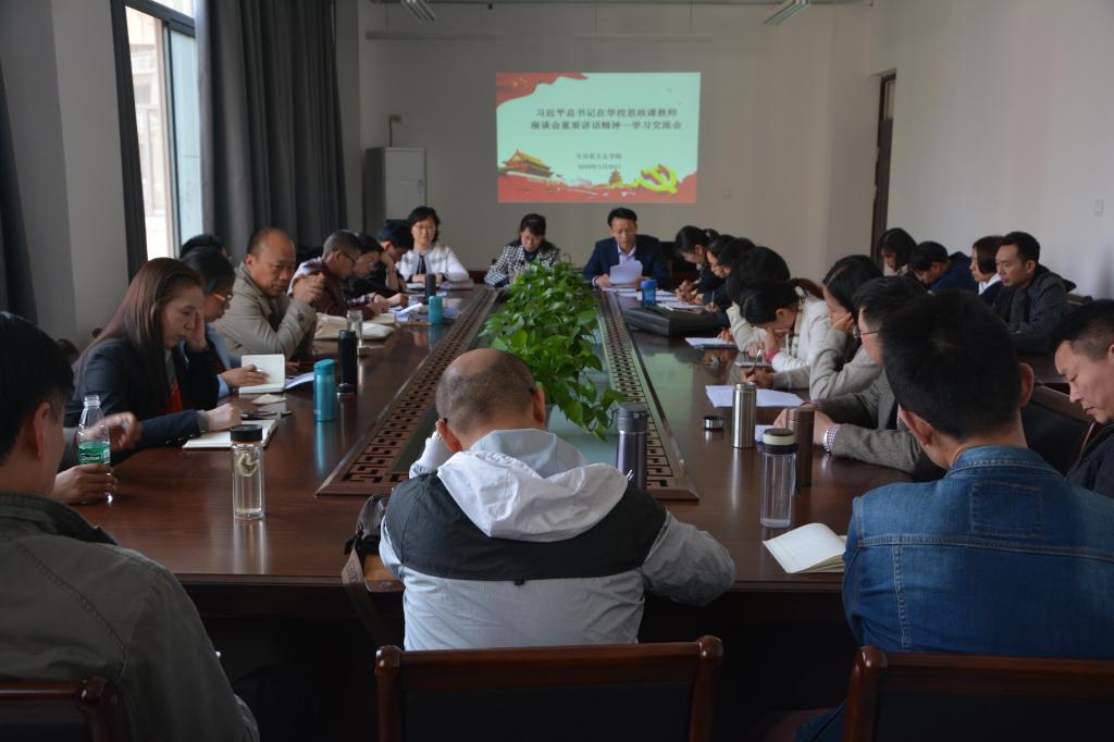 会上,虎业勤带领大家认真学习了习近平总书记在学校思想政治理论课教师座谈会上的重要讲话,传达了学校领导在学校召开的由各职能部门、学院代表参加的座谈会上的要求。与会人员积极发言,围绕习近平总书记提出的思政课教师须具备的“六个要”和思政课教学要做到的“八个统一”,结合本职工作实际,畅谈自己学习习近平总书记在学校思政课教师座谈会上的重要讲话精神心得体会,就工作中遇到的问题进行交流,提出建议,明晰了下一步的工作思路。