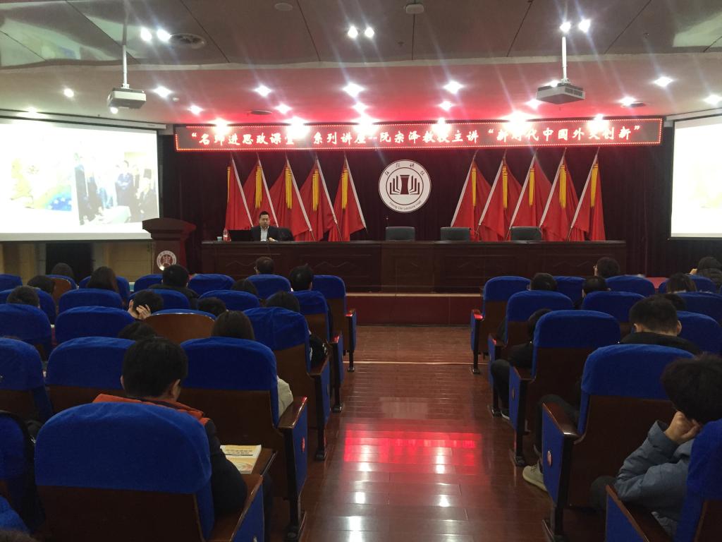 2019年12月23日下午,应我校太阳集团tyc151cc邀请,中国国际问题研究院阮宗泽研究员应邀来我院授课,在图书馆八楼学术报告厅为我校师生作了一场题为“新时代中国外交理论创新与实践贡献”的学术报告。报告会由太阳集团tyc151cc院长随新民主持。太阳集团tyc151cc全体专兼职教师、研究生、部分专业本科生聆听了报告。