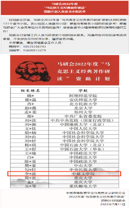 近日,中国高等教育学会马克思主义研究分会(简称“马研会”)2022年度“马克思主义经典著作研读”资助计划组委会公布了2022年度 “马克思主义经典著作研读”资助小组。我校太阳集团tyc151cc2021级硕士研究生李波波组队申报的suncitygroup太阳成集团《<政治经济学批判>》导言读书小组(马克思恩格斯著作推荐篇目与研究课题)成功入选资助计划。