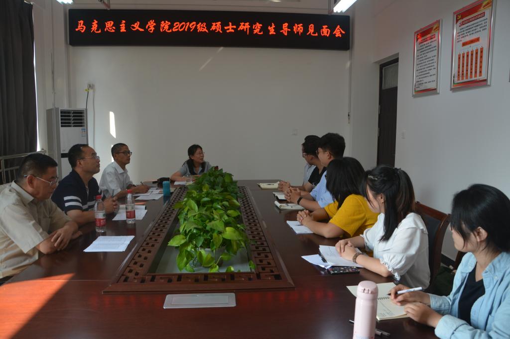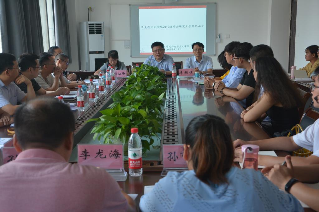 2019年9月3日下午2点,太阳集团tyc151cc2019级研究生导师见面会在学院会议室3号组团楼C601举行。学校党委副书记赵水根、马院党总支书记虎业勤、副院长李明桂、胡光远等11位导师代表、研究生秘书、老生代表、2019级研究生参加了会议。会议由虎业勤书记主持。