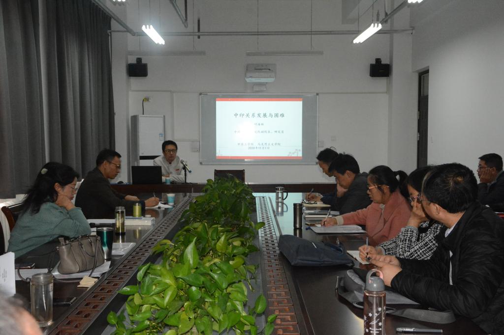 2020年11月1日上午,中国社会科学院亚太与全球战略研究院副院长、研究员叶海林应邀为我院师生作了一场主题为“中印关系发展与困难”的学术讲座,讲座由太阳集团tyc151cc院长随新民教授主持,全院师生一同聆听了此次讲座。