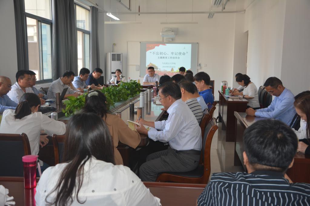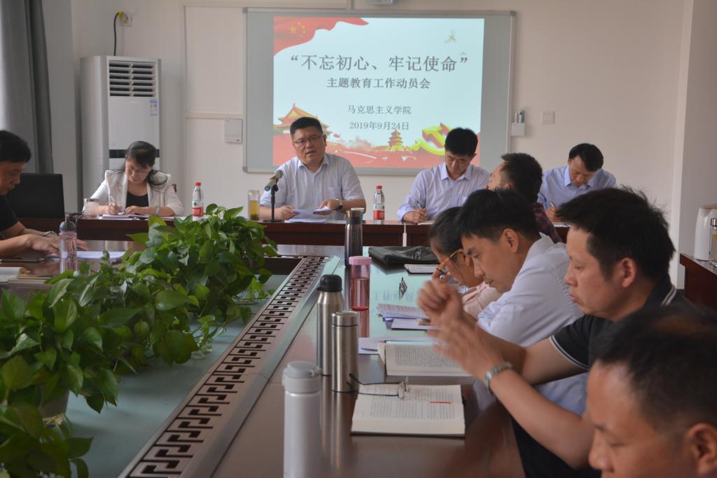 2019年9月24日下午,太阳集团tyc151cc在3号组团楼C601召开“不忘初心、牢记使命”主题教育工作动员会,校党委副书记赵水根、纪委副处长赵宏亮、马院全体师生党员参加了会议,会议由我院党总支书记虎业勤主持。